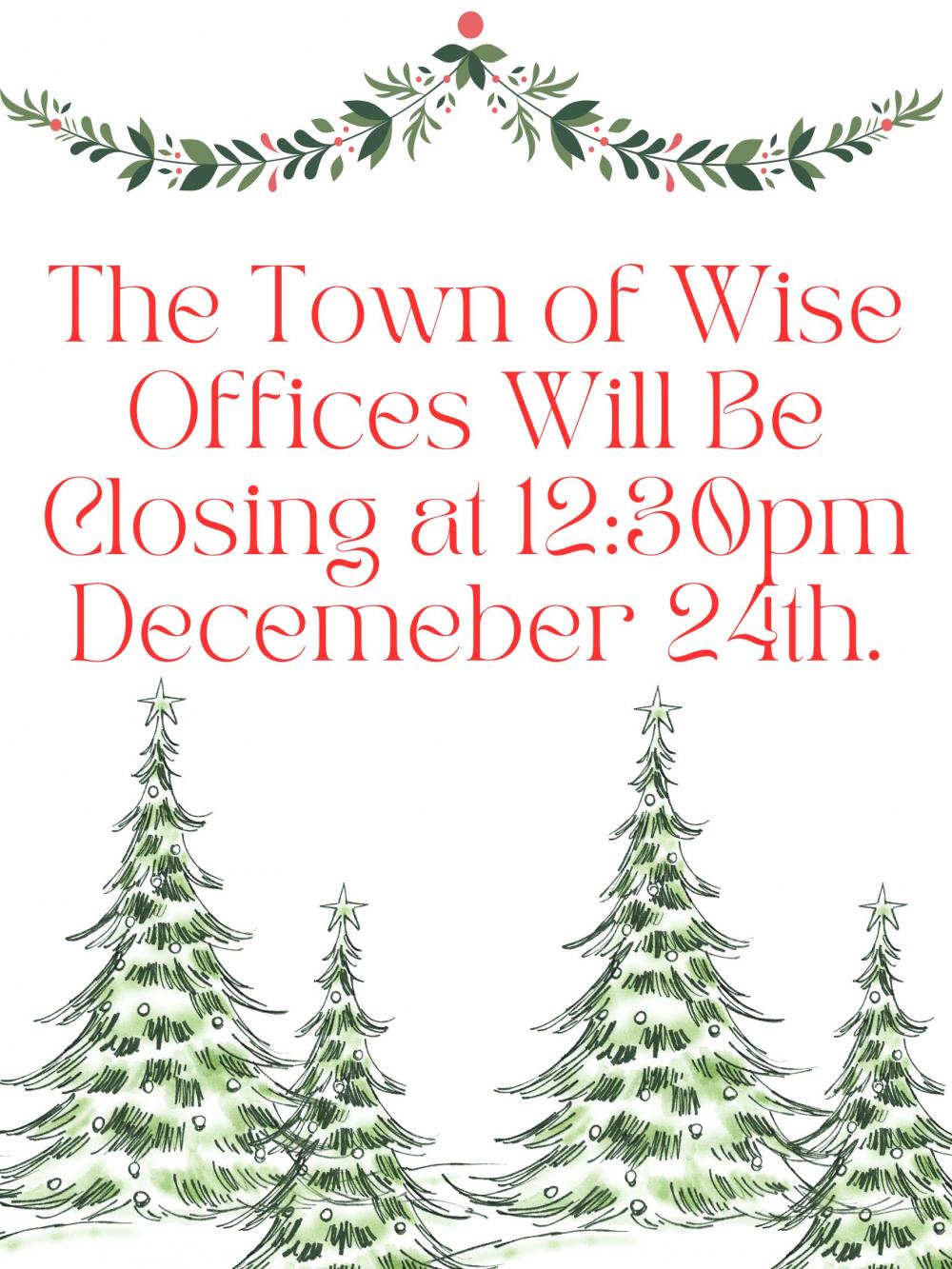 The Town of Wise Offices will be closing at 12:30pm on December 24th in observance of the Christmas Holiday.